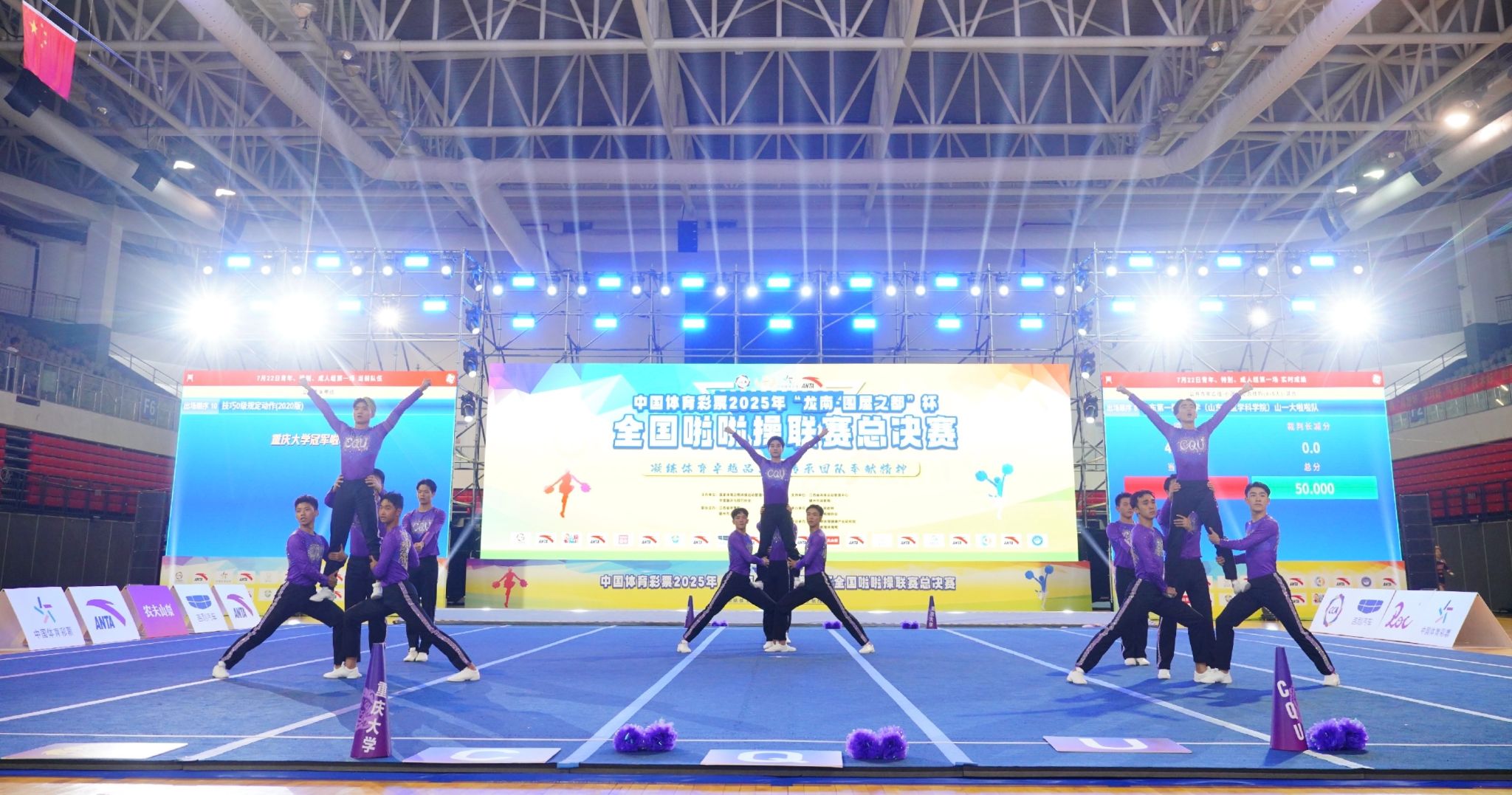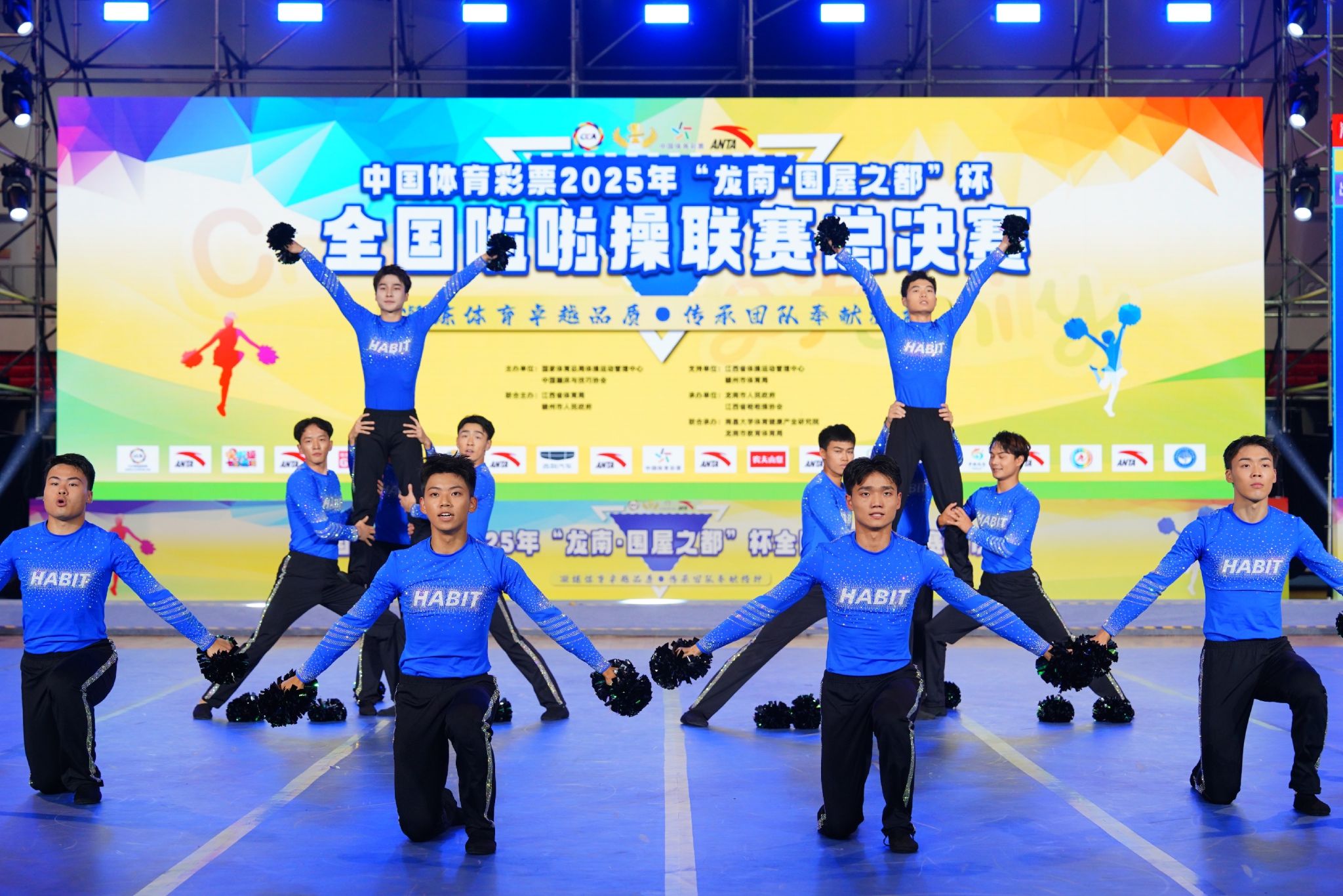 全男子啦啦操队在刘衡、周任洁两位教练的带领下表现抢眼,一举斩获公开青年甲组技巧0级规定动作(2020版)和集体自由舞蹈自选动作(徒手组)两项冠军,并在花球规定动作(2025版-初级A)项目中获得亚军,成为本届赛事最耀眼的明星队伍。