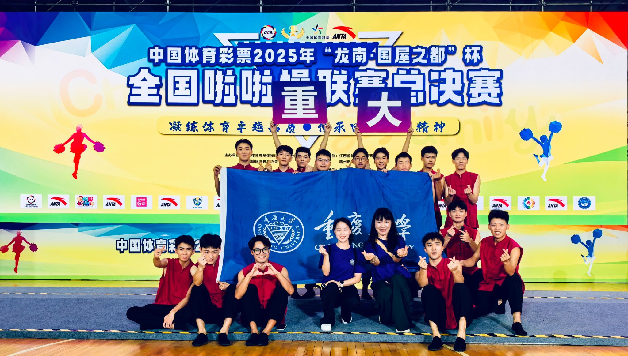 在高温酷暑下,教练团队带领队员进行了为期30天的封闭式集训。队员们日夜打磨每一个技术细节,将动作精度和艺术表现力推向极致。这份执着与汗水最终在赛场上得到了完美回报:在技巧0级规定动作比赛中,队员们以刚柔并济的完美表现征服裁判;身着蓝色队服的花球项目中,他们用精准划一的动作演绎出动感美学;而在最具创意的自由舞蹈环节,红色马甲的队员们以爆发力十足的表演配合震撼的声效设计,展现了无与伦比的团队。